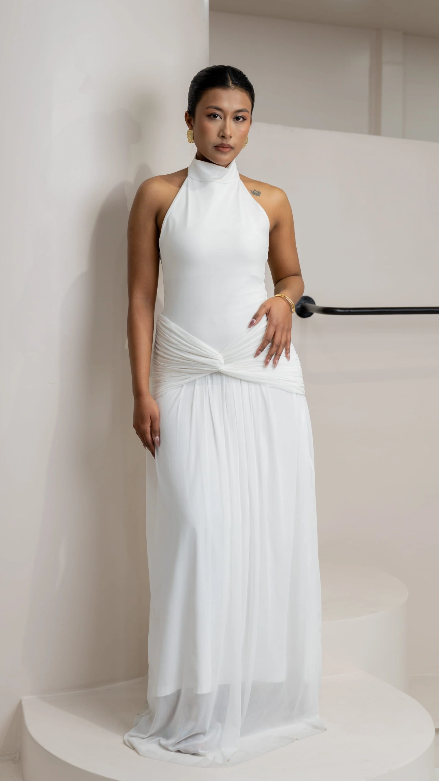 The Calanthe Dress is a soft, feminine statement piece designed to flatter the silhouette with effortless elegance. Crafted from a premium blend of mesh and lycra, it offers a smooth stretch fit with graceful draping and movement.