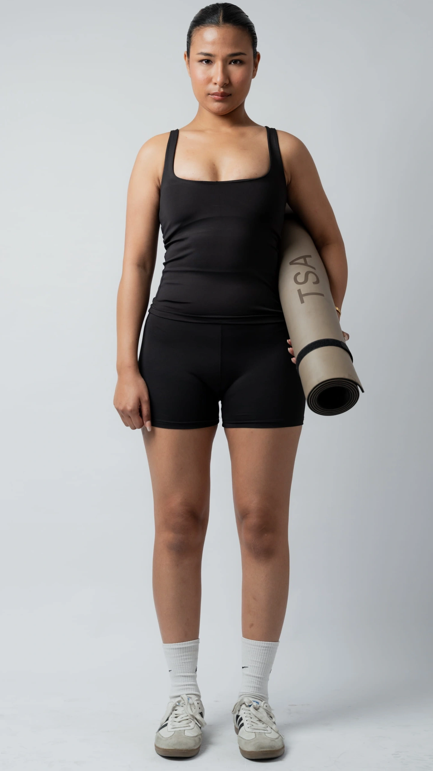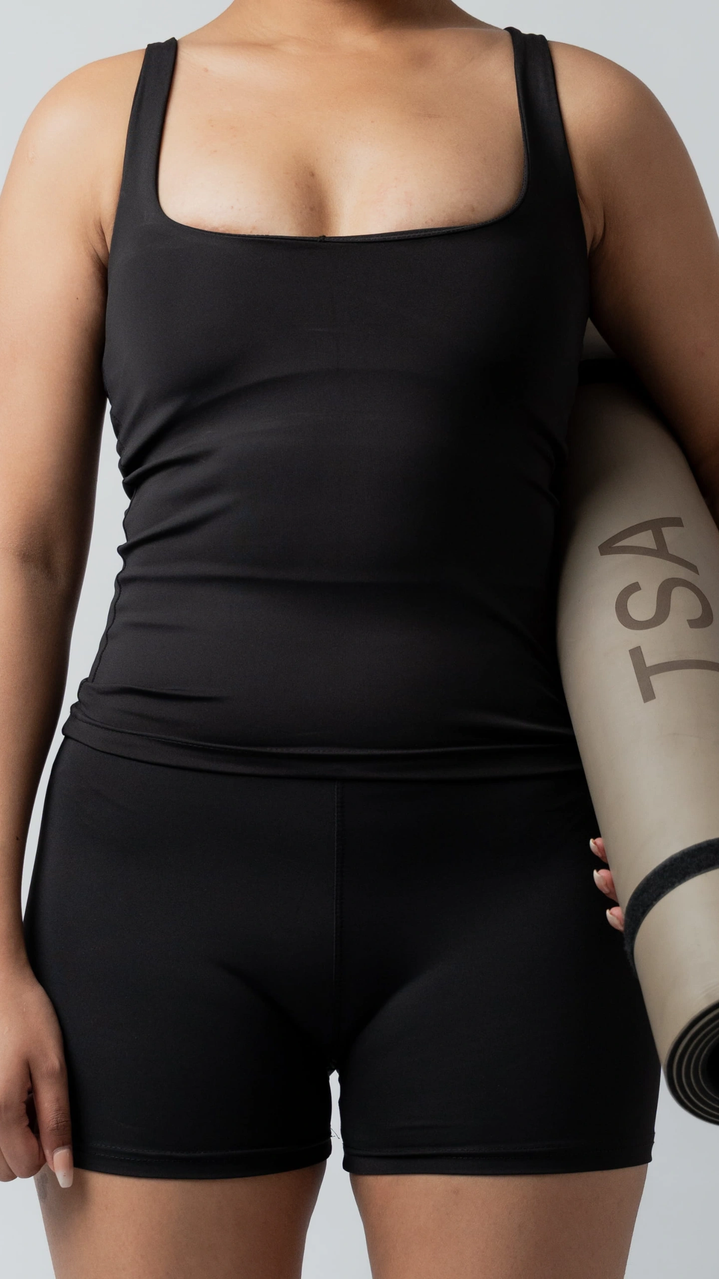 Designed for movement and everyday ease, this matching set is crafted from smooth, stretchable spandex that hugs the body while allowing full flexibility. The scoop neck top offers a flattering, minimal silhouette, paired with high-stretch shorts for a sleek, sculpted fit.