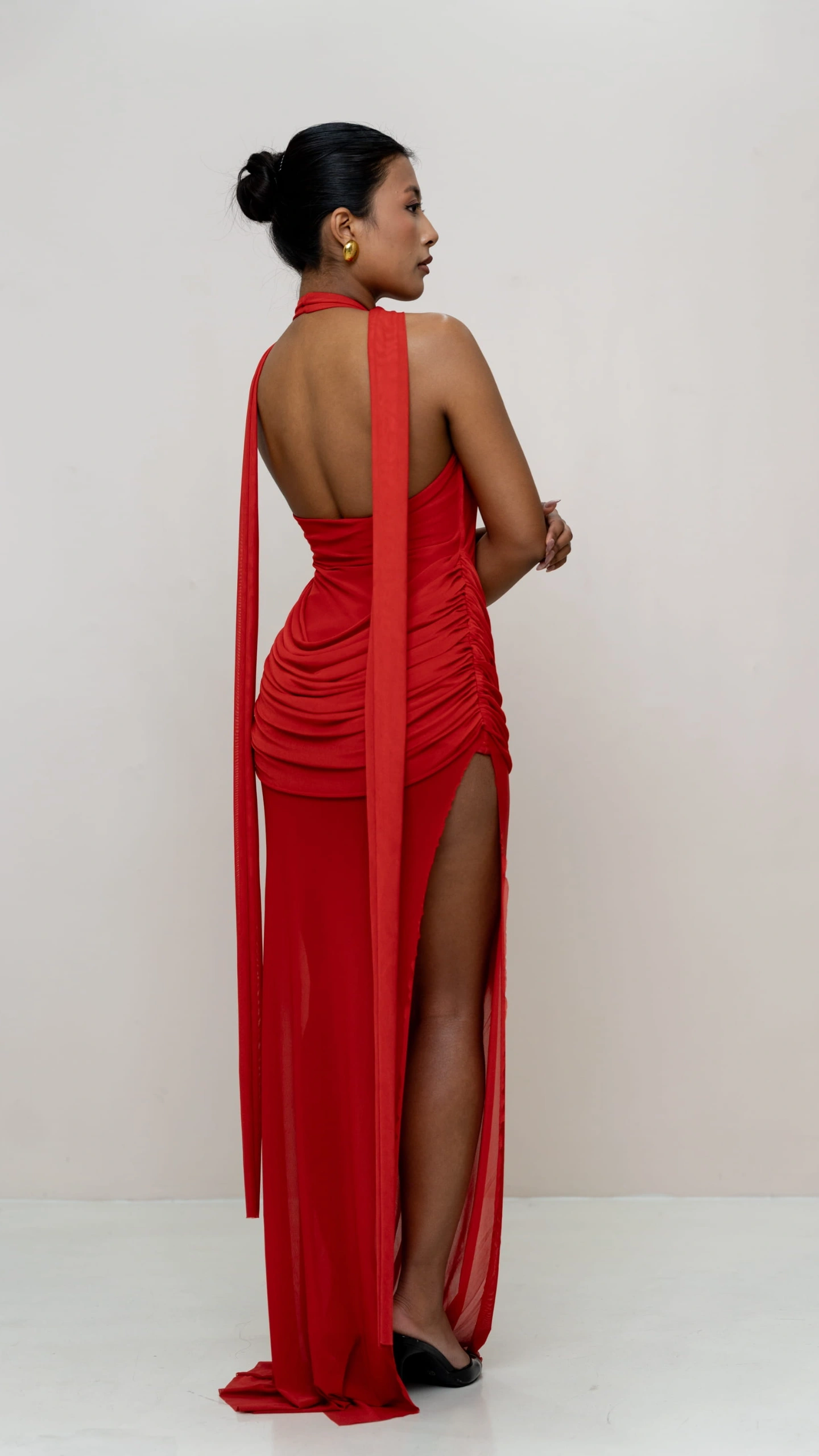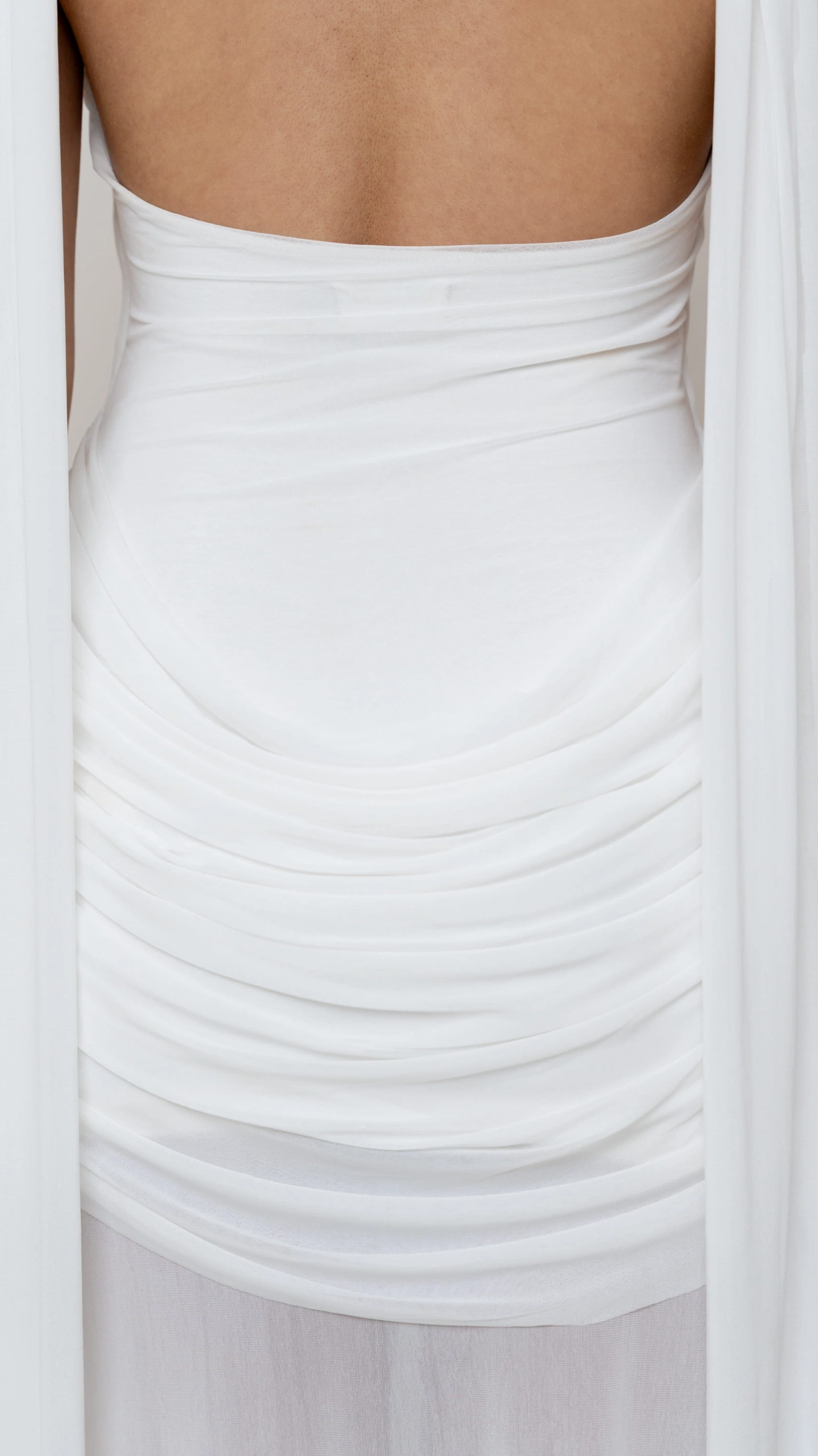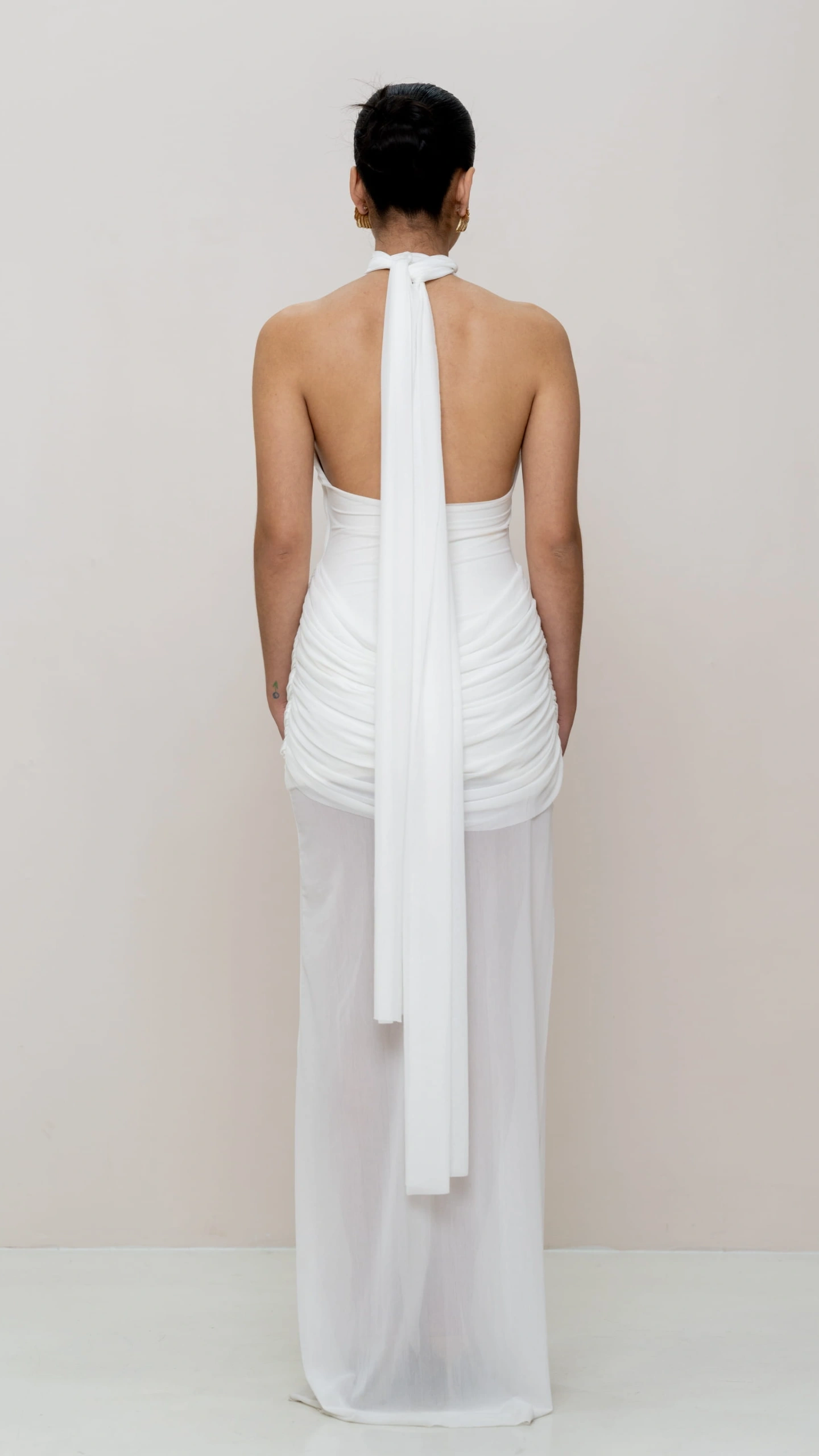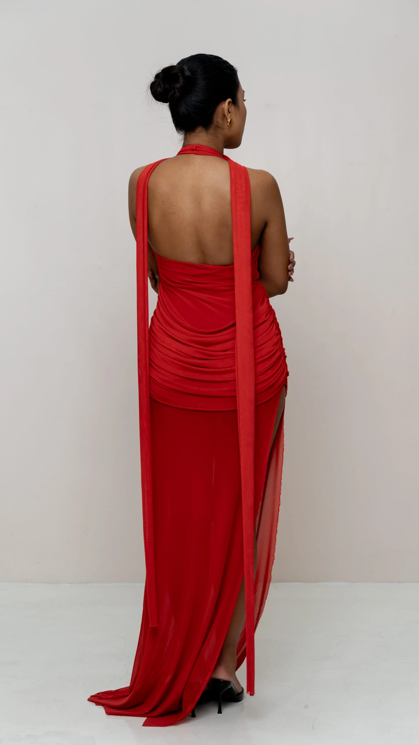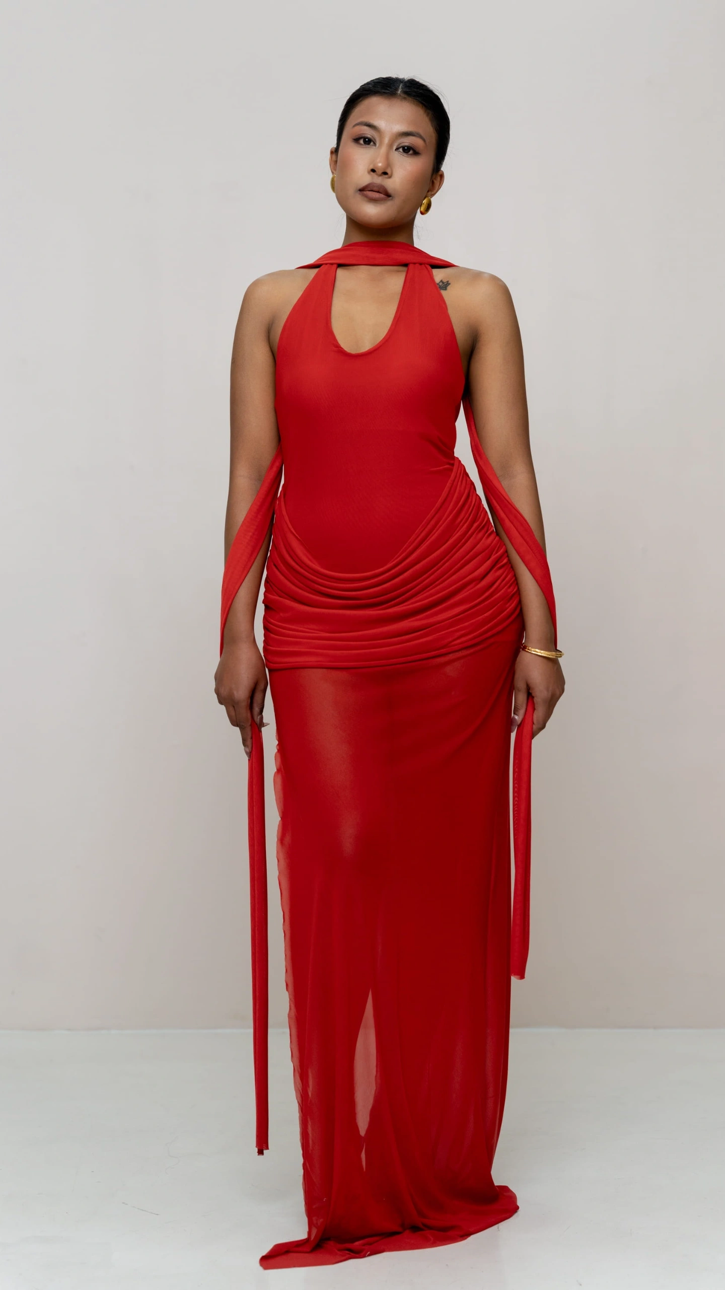 This elegant statement dress is crafted to flatter and flow. Designed with a sculpting inner layer and a sheer outer silhouette, it balances structure with softness. The asymmetric neckline and draped detailing add a modern, elevated touch, while the fluid fall enhances movement and grace.